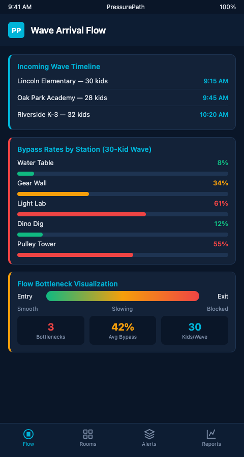 The starting point for any bypass intervention is documentation: which stations are being bypassed, at what rate, under what wave conditions. That documentation doesn't require sensors or advanced analytics on day one. A docent with a tally counter and 30 minutes of observation during a school wave produces enough data to identify the top three bypass points in any floor plan. Start there. Build the model from observed data. Then use PressurePath to simulate the effect of specific interventions before committing to physical changes.