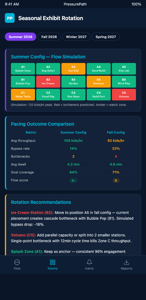 If your museum runs two or more seasonal exhibits per year, you're resetting your bypass map multiple times each school visit season without any preview of where the new failure points will be. PressurePath gives children's museum exhibit designers a pre-opening simulation that maps those failure points before the first school bus arrives. Join the waitlist to run a simulation on your next seasonal rotation plan.