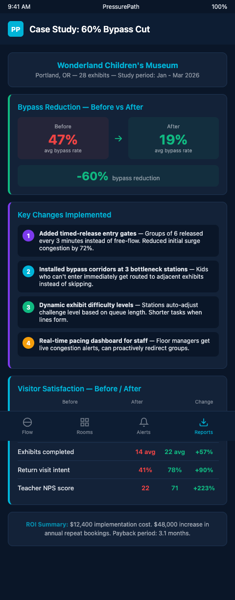 The three-intervention framework—rope partition adjustment, entry stagger, docent positioning shift—is repeatable because it addresses the three primary pressure variables: approach corridor resistance (partition), wave arrival timing (stagger), and social friction at the pressure drop point (docent positioning). Most structural bypass problems at children's museums involve at least two of those three variables. Identifying which two and quantifying the expected effect of each adjustment is what PressurePath's simulation layer does before any physical change is made. The follow-on work on refreshing bypass-heavy stations built directly on this pressure-cascade framework, applying the same diagnostic sequence to stations that had undergone previous content refreshes without addressing the underlying flow cause.