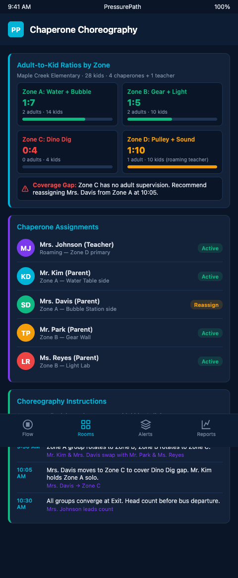 PressurePath generates the chaperone brief automatically from your floor plan and learning goals. The brief maps chaperone positions to specific stations, specifies timing windows for each position, and includes the two-question hold script appropriate for each exhibit's content. Children's museum educators and exhibit designers who want to run that generation for their next field trip day should join the waitlist.