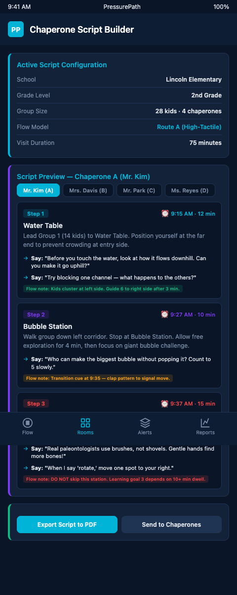 The script delivery mechanism matters as much as the script content. Peoria Riverfront Museum's chaperone guide template and The Henry Ford's zone-by-zone behavioral cue guide both use a zone-by-zone format that aligns with how chaperones physically move through the floor. PressurePath outputs scripts in the same format: one page per chaperone sub-group, organized by zone sequence, with opening prompts, engagement cues, and transition signals for each station.
