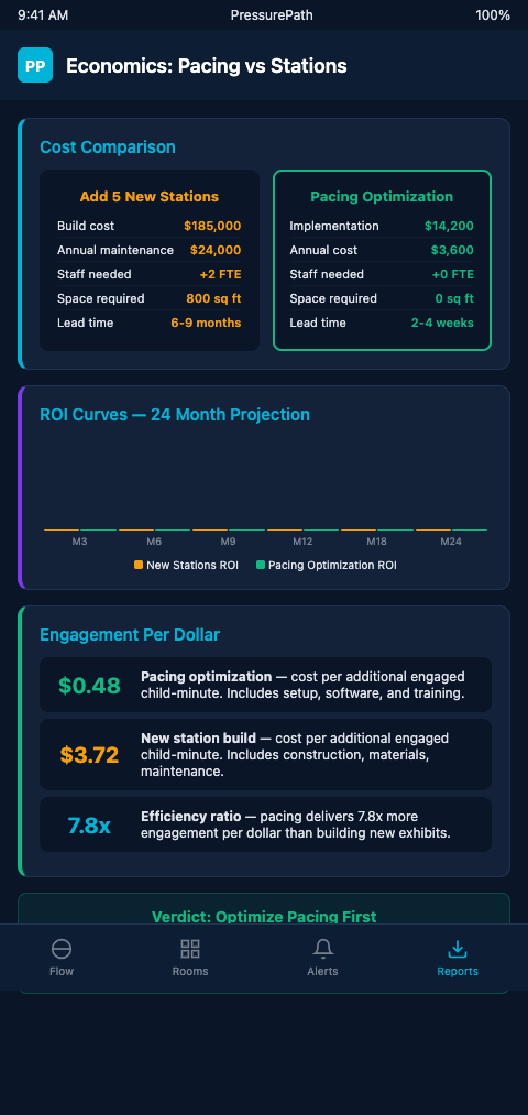 The board presentation version of this argument runs as follows: your floor currently has $2.3M in installed interactive station capital. Your average bypass rate on school-wave days is 67%. That means 67% of your station capital is not delivering its intended educational return during your highest-attendance sessions. A $25K pacing investment that drops bypass to 35% on school-wave days unlocks $770K in previously under-performing capital. No new fabrication required.