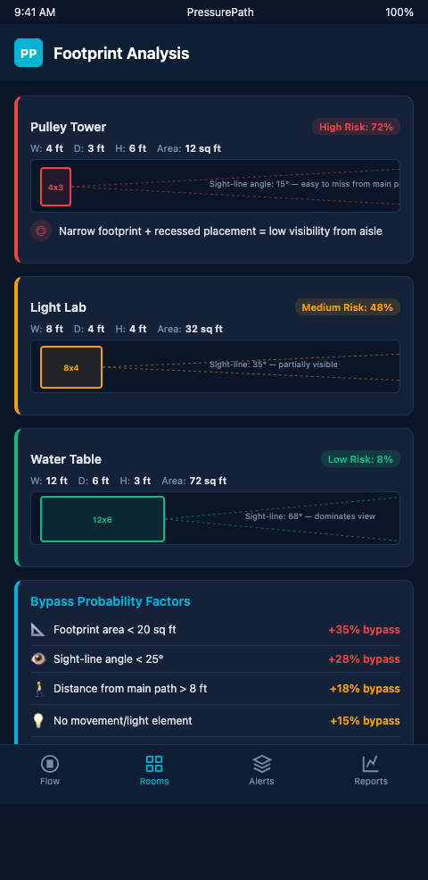 PressurePath treats every station as a node in the floor plan's pressure network and assigns each node a bypass risk score based on its footprint variables. That score predicts the fraction of a 30-kid wave that will bypass the station under normal field trip conditions.