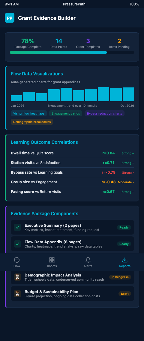 If PressurePath is running on your floor, every school-group visit is generating grant-worthy evidence. The question is whether that data is being structured to speak the language of IMLS and NSF reviewers. Join the waitlist to see how children's museum exhibit designers are using PressurePath flow data to build evidence bases that support both operations improvement and grant documentation simultaneously.