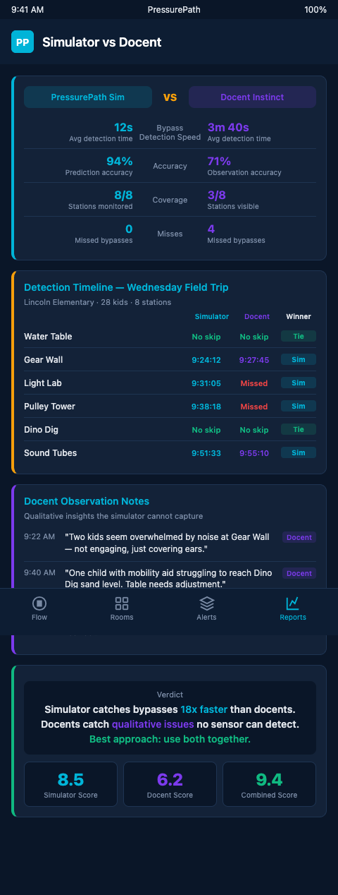 The combination that produces the best outcomes is neither "docents only" nor "simulator only" — it's a defined division of labor where each tool handles the functions it's structurally suited for. The docent manages facilitation, accessibility accommodation, mechanical anomaly detection, and real-time social dynamics. PressurePath manages continuous multi-station bypass monitoring, quantitative baseline comparison, structural bypass pattern detection, and alert routing.