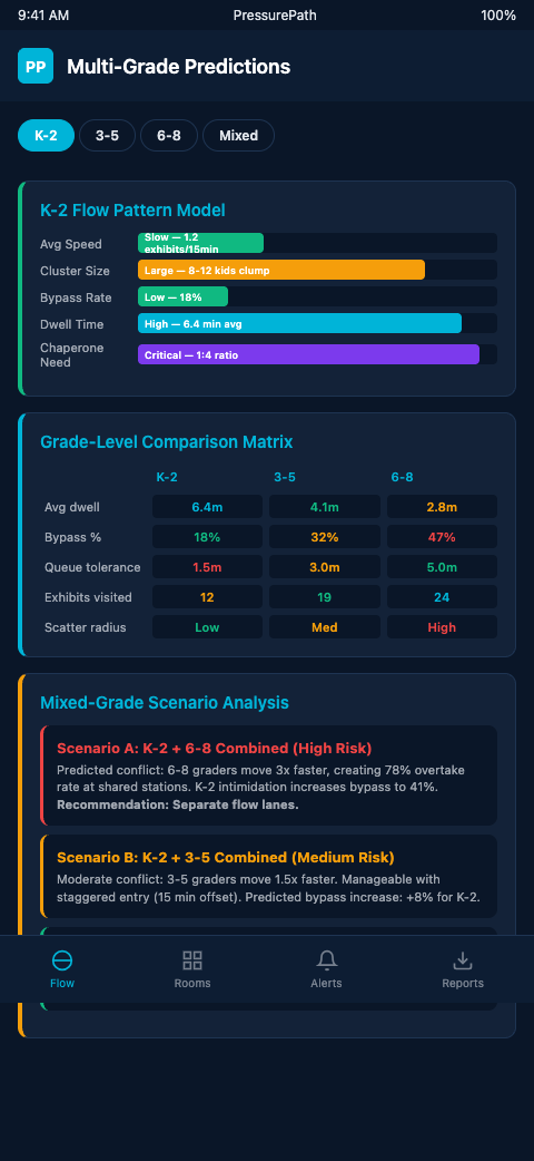 The ops implication is that multi-grade days require grade-specific floor protocols, not a single universal school-group protocol. The docent positioning, partition configurations, and stagger recommendations that work for a pure third-grade morning need to be adjusted for a mixed-grade afternoon. PressurePath's wave-prediction model produces grade-specific pressure forecasts that allow the ops team to configure the floor differently for each time slot rather than using a static school-day setup.
