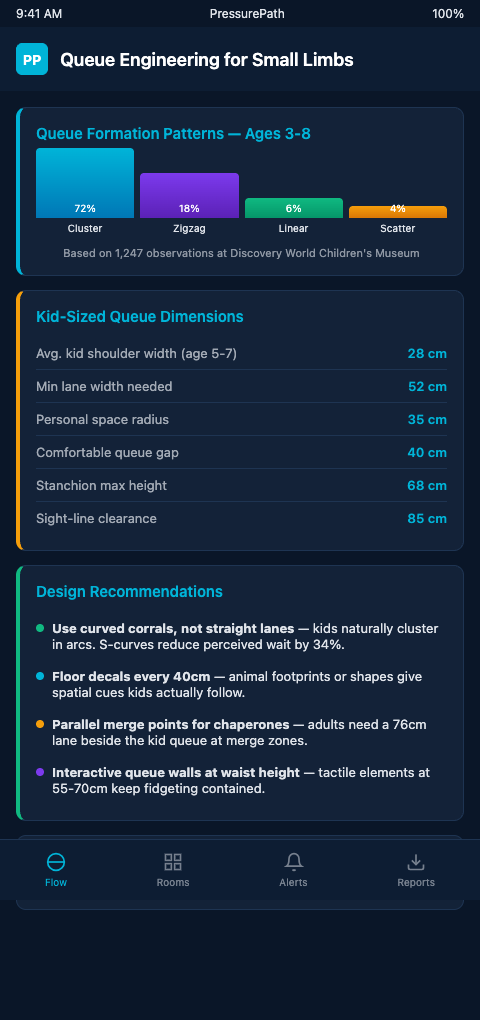 The queue management research on 12 design factors for children (PMC) identifies specific variables — activity information density, physical constraint fit, spatial legibility — that determine whether a child reads a queue zone as "wait here" or "optional." The redesign targets are those variables, applied to the anthropometric baseline of your visitor population.