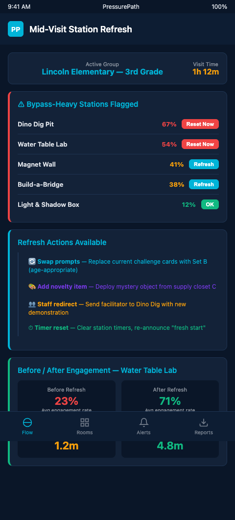 Mid-visit refresh is the difference between recovering 30% of a bypassed station's potential engagement and writing that session off. The 15-minute window is real and actionable for children's museum exhibit designers who have the alert system to see it and the intervention toolkit to use it.