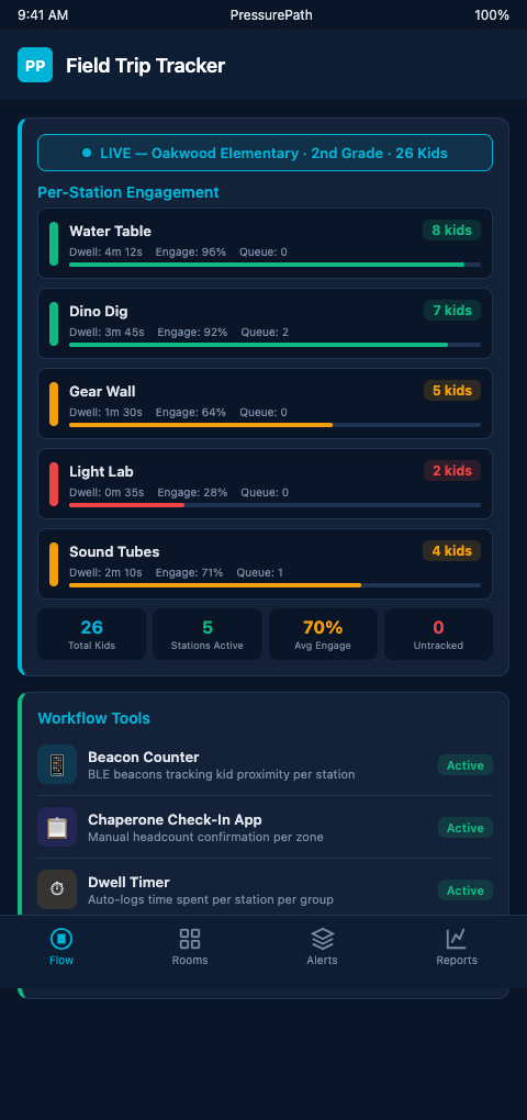 PressurePath gives exhibit designers a persistent tracking baseline that accumulates across every field trip day, turning each school wave into a data point that sharpens the flow model. If you design interactive exhibits for school groups and want to know which stations are working at the station level, join the waitlist for PressurePath and see how your current engagement data maps to bypass patterns.
