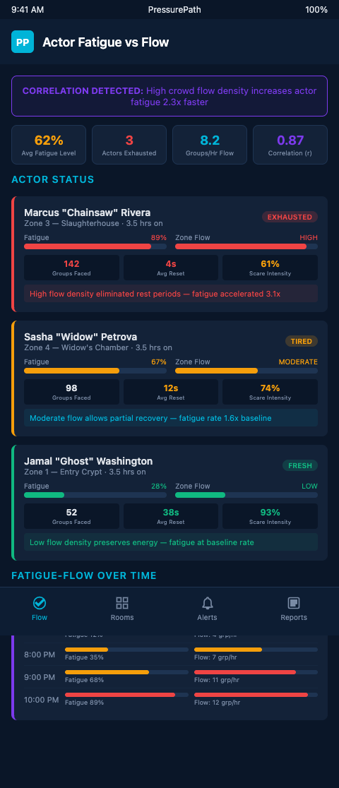 PressurePath gives haunted attraction designers the reset-window compression forecast that turns actor fatigue from an inevitability into a managed variable. You see which positions need rotation adjustments, which dispatch windows need gap insertions, and which peak hours will push your highest-demand actors past sustainable workload thresholds.