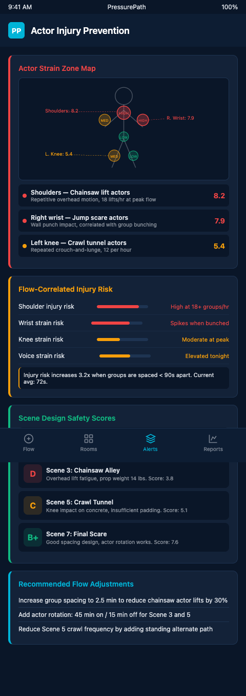 Model fatigue-adjusted safety margins. Introduction to Performing Arts Safety (UCOP) notes that "show must go on" culture overrides safety, and that time-pressure and fatigue compound physical risk. An actor who is physically fresh can absorb and respond to an unexpected guest trajectory. The same actor at hour three of a peak night has slower reflexes and higher contact vulnerability. PressurePath's fatigue modeling layer lets you overlay actor rotation schedules against density peaks to identify when your safety margins are at their thinnest.