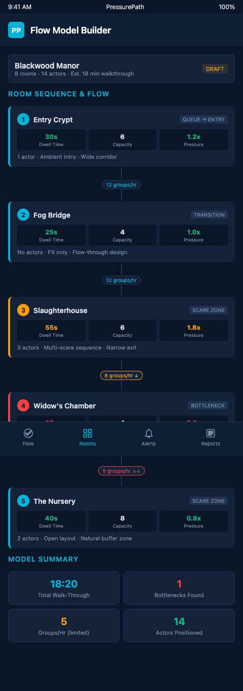 PressurePath integrates this room-by-room data into a peak-night pressure simulation. You define each room's parameters, set your dispatch interval and ticketing schedule, and the simulation produces a per-room, per-minute density forecast for your heaviest expected night. The model shows you which rooms will exceed functional scare density thresholds and at what time — before a single guest has ever walked through.