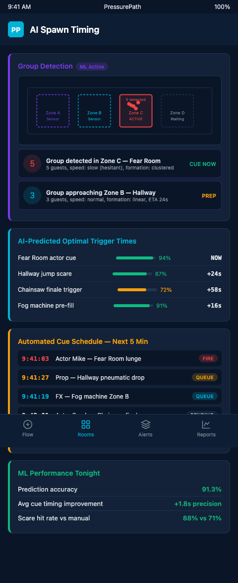 Training on a machine spawn timing system should run during the pre-season simulation period, not on opening night. PressurePath's simulation mode lets gate staff practice responding to simulated chamber occupancy data at full peak-night volume — a dry run where override decisions produce visible downstream consequences in the simulation rather than in a live scare chamber. After four to six hours of simulation-mode training, most staff have developed the judgment to distinguish machine recommendations that should be followed from genuine edge cases where manual override is appropriate.
