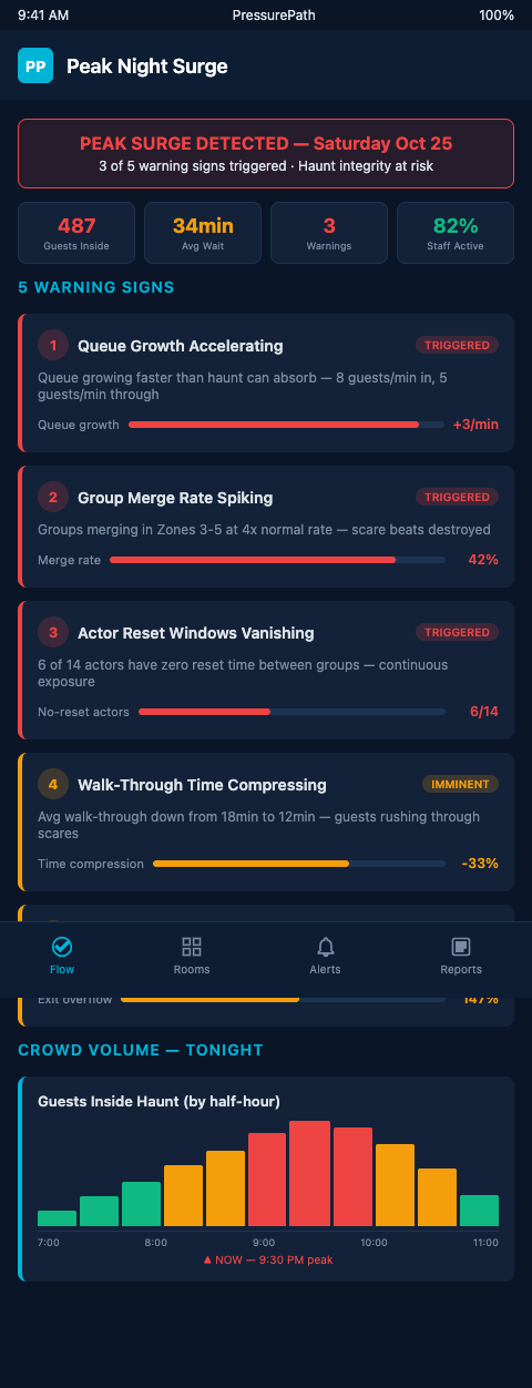 PressurePath's peak-night forecast gives haunted attraction designers the timeline to run through in the briefing — showing staff exactly when Warning Signs 1 through 5 are expected to appear and what the response sequence is. Floor teams who have internalized that timeline make better real-time decisions because the situation they are managing on October 28th is not a surprise. They have already seen it on a chart.