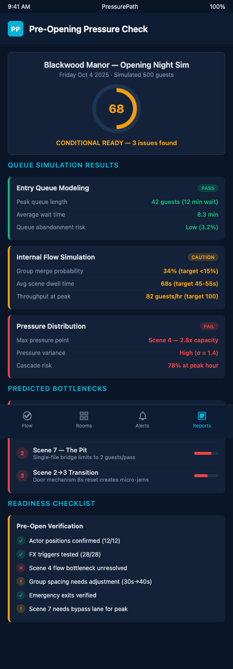 PressurePath converts your haunt's physical dimensions and ticketing plan into a peak-night density forecast with chamber-level specificity. Build the model in September. Adjust the dispatch schedule, the entry windows, and the chamber geometry based on the results. Walk into opening night knowing exactly what your pipe can handle — and what it cannot.