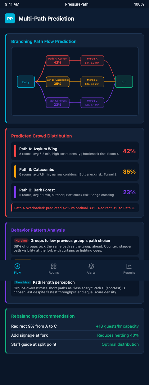 PressurePath's branching path simulation gives you the full distribution curve for your multi-path haunt under peak-night conditions — before you staff the actor roster or set the spawn interval. Join the waitlist for haunted attraction designers and access the multi-path predictive model alongside your spawn-interval and density mapping modules.