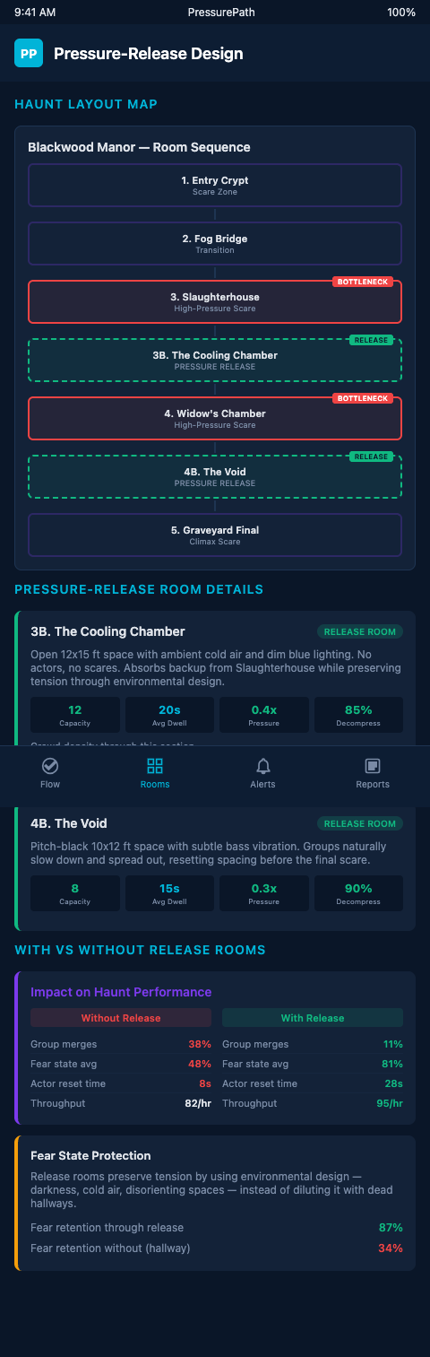 Standard pressure-release rooms are static — a fixed space between two scare chambers. Advanced design uses variable decompression: rooms with multiple slow-path options, actor-free zones with ambient audio that extend dwell time for compressed groups without blocking flow for well-spaced groups.