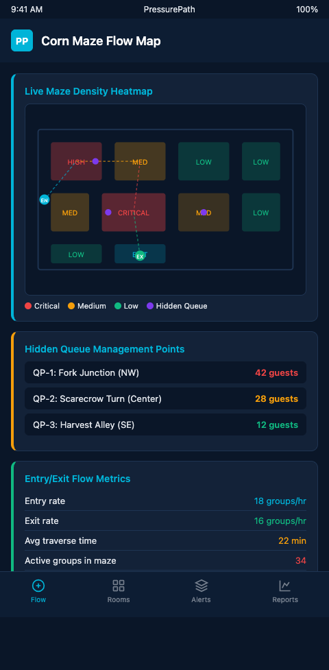 PressurePath applies the same modeling logic to corn maze path networks. The pre-opening pressure check for a corn maze identifies convergence risk at each junction point and recommends the batch intervals and path-assignment strategies that reduce simultaneous arrivals to the scare chamber. The model doesn't require sensor infrastructure — it uses path length, width, and average transit time to predict flow state.