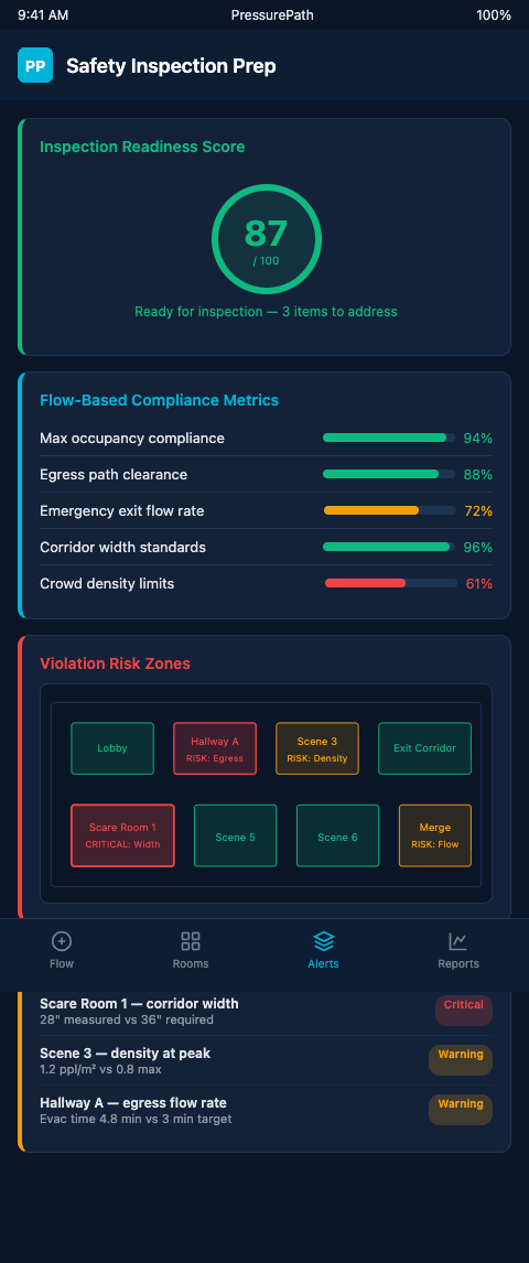 PressurePath generates fire marshal-ready density documentation as a direct output of the pacing model haunted attraction designers use for actor timing. Stop building your inspection file from scratch every season. Join the waitlist and get the flow data format that satisfies occupant load documentation requirements before pre-season inspection is scheduled.