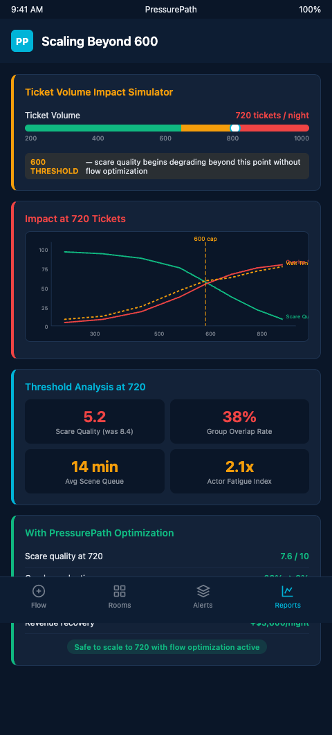 Every haunted attraction scales until the slowest room says no. That room is usually not the one the operator expects — it is a decompression zone that was adequate at 450 tickets and undersized at 620, or a corridor bend that absorbed compression at 480 and generated backflow at 580. The 600-ticket ceiling is not a universal number; it is the point where your specific haunt's narrowest pipe reaches its maximum working pressure. Finding that number requires running the full room-by-room pressure simulation at the target ticket count, at the actual batch composition you plan to sell, and at the peak-night arrival distribution your ticketing system will produce.