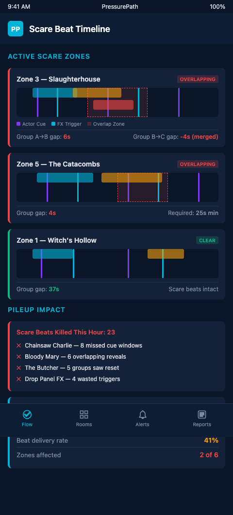 PressurePath gives haunted attraction designers the pressure map that connects your dispatch interval to your actual chamber beat window across every hour of peak night. You see which chambers will lose their scare beat windows and at what density thresholds — specific enough to make decisions in September rather than on the floor in October when it is too late to change the script.