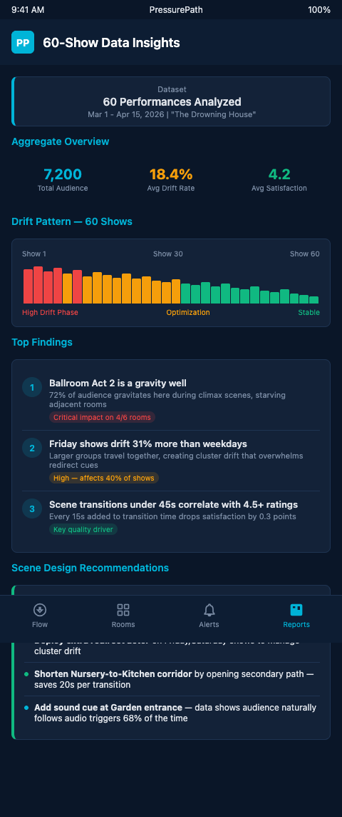 Immersive theater companies currently in a long run and interested in synthesizing their performance data into a calibrated flow model are the audience this analysis was written for. PressurePath's production audit program builds a retrospective drift model from your existing SM logs and generates a prioritized intervention list for the current run. Contact the team for a production audit consultation.