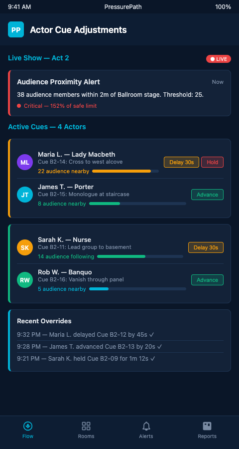 Immersive theater companies managing long runs of multi-scene non-proscenium work need mid-show cue adjustment protocols that actors and SMs can execute without improvisation under live pressure. Join the PressurePath waitlist for flow-triggered cue adjustment tools built for immersive running workflows.
