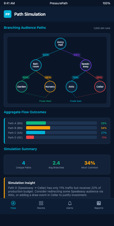 For choose-your-path formats specifically, the simulation also supports a sensitivity analysis on the number of active paths. If a production is considering whether to run 4 paths or 6 paths simultaneously, PressurePath can simulate both configurations against the same agent distributions and compare the range of scene-population outcomes. More paths typically mean lower per-path populations and more variance in individual path experience — the simulation quantifies how much more variance, which tells the director whether six paths is an artistic enrichment or an operational management problem at their intended audience size.