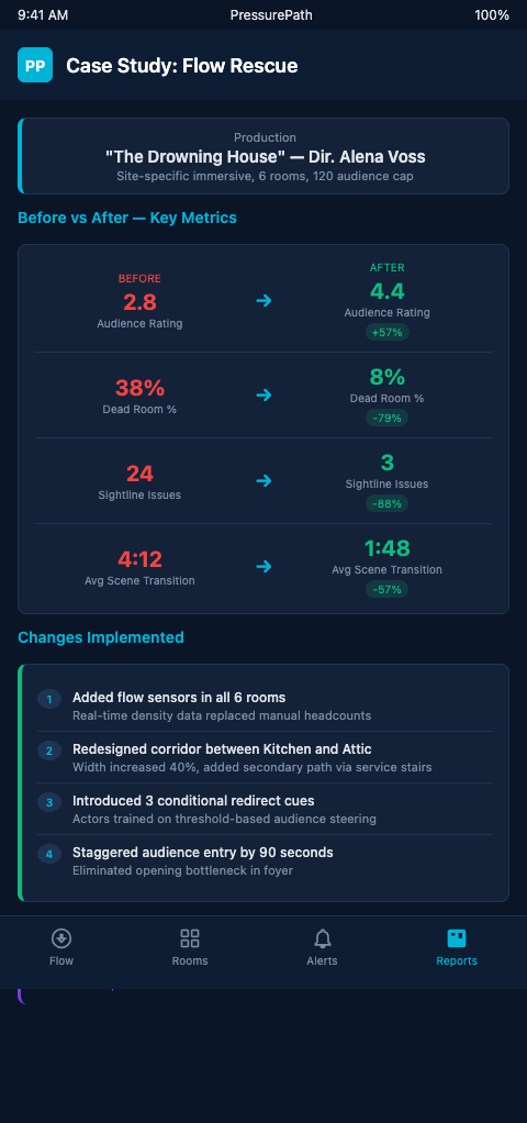 Malthouse Theatre's "Because the Night" used 360° documentation to build iterative design knowledge (The Immersive Archive, Tandfonline) — the principle is the same: documented performance data produces better redesign decisions than aesthetic instinct alone. The director ran the flow audit through PressurePath, mapping the venue as a pressure network: three scenes in Act 2, two corridor connections, sightline density ceilings per room.