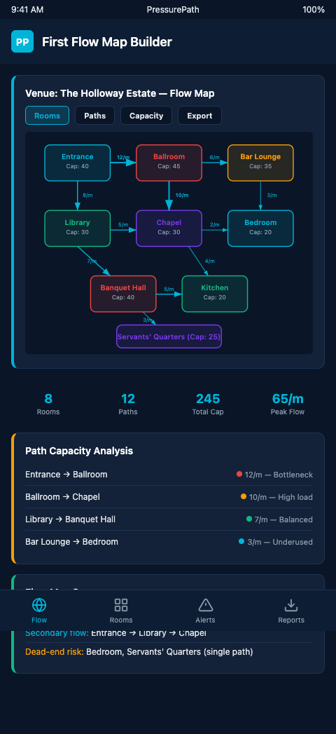 Step 3: Model the pressure flow. Using the density targets and the pull values, trace the projected audience distribution at each timestamp. This is where PressurePath's simulation becomes the primary tool: the platform takes your venue map, your scene pull values, and your cue-exit schedule and outputs the projected density per room at each timestamp. The output is your first flow map.