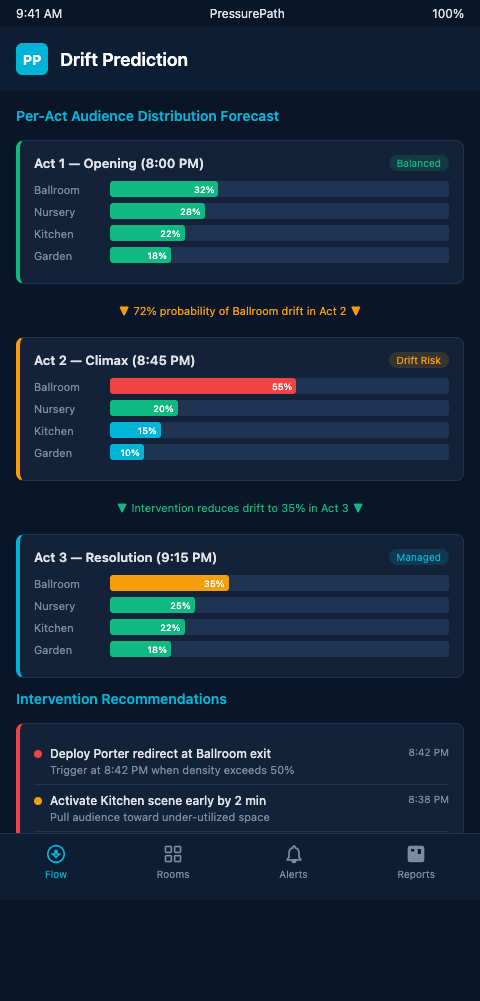 PressurePath exists precisely for multi-act structural decisions. Immersive theater companies building or rebuilding multi-act productions are invited to use PressurePath's drift simulation toolset — bring your floor plan, your act structure, and your scene timing sheet, and let the model show you where Act 3 goes wrong before it happens in front of an audience.