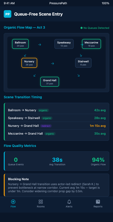 Immersive theater companies producing Sleep No More-style promenade work in multi-room venues need queue-free entry design that is structurally sound rather than operationally heroic. Join the PressurePath waitlist for queue-formation risk modeling built for non-proscenium immersive production workflows.