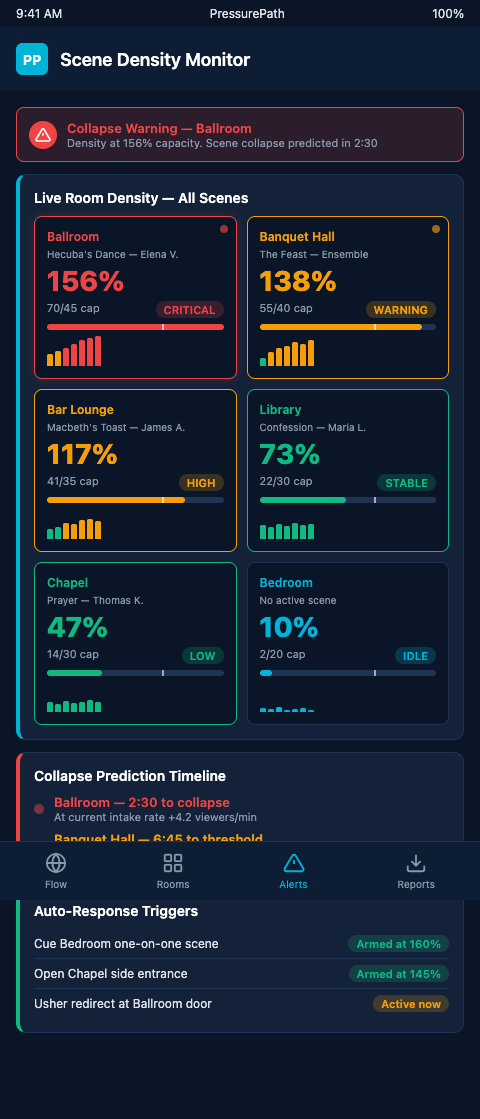 Stage managers who have worked with PressurePath's packed scene detection layer before opening night know exactly which intervention to activate — and when — before the collapse sequence begins. Directors interested in building this detection infrastructure into their next immersive production: join the waitlist for immersive theater companies and model your packed scenes before tech week.