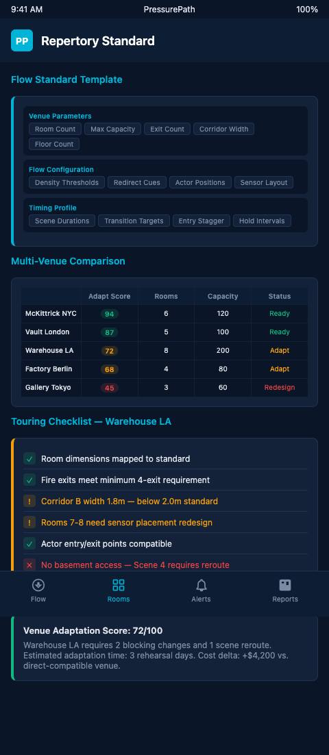 PressurePath translates this framework into a venue-comparison model. The production team inputs the origin venue's geometry and the flow standard parameters. Before each touring installation, they input the new venue's geometry. PressurePath generates a difference map: which corridors are wider, which scenes have different acoustic profiles, which transitions have altered sightline geometry. The difference map drives a targeted list of compensating adjustments rather than a complete re-blocking.