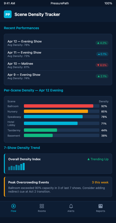Immersive theater producers and directors managing multi-performance runs of non-proscenium work need scene density tracking that accumulates into pattern knowledge — not isolated night-by-night reports. Join the PressurePath waitlist for multi-performance density aggregation tools built for immersive production tracking.