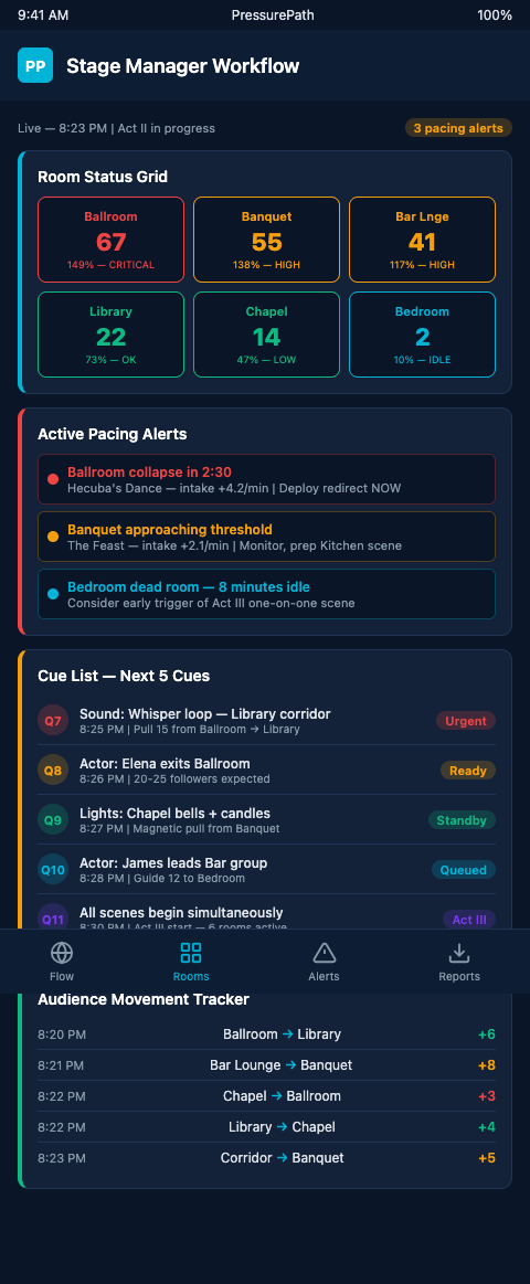 Stage managers at immersive theater companies producing multi-room work with live audience routing need a pacing workflow that travels with the calling script — not a separate system that competes for attention. Join the PressurePath waitlist for SM-ready pacing playbooks built specifically for multi-room immersive productions.