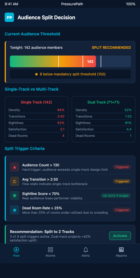 The rule: when the production simulation shows that more than 2 scenes per act will exceed the herding threshold in more than 40% of simulated performances at the current capacity, the single-track format has reached its structural limit. That's the split trigger.