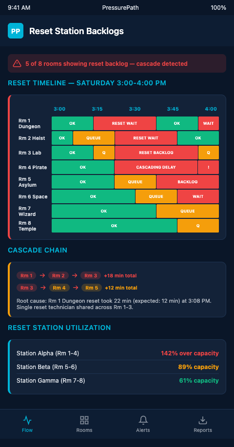 PressurePath is currently onboarding multi-room escape room operators who want to model their exact reset station constraints before their next peak weekend. If you run 8 rooms and your Saturday reset team is regularly firefighting the 3 PM wave, we'll load your booking grid and show you the specific slots creating structural backlog — before you spend another Saturday firefighting it.