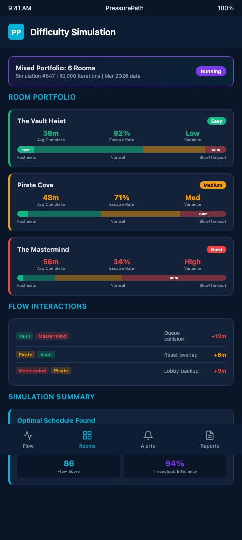 PressurePath's mixed-difficulty simulation is ready to run with your current room configuration. Input your room list, assign difficulty tiers, and upload your last 90 days of session completion times. The first simulation pass will show you exactly where difficulty divergence is creating junction pressure in your current schedule — and what a resequenced booking grid would do to Saturday throughput.