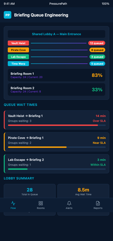 PressurePath's shared lobby pressure analysis identifies the exact Saturday windows where your current booking configuration produces briefing queue collisions, calculates the start-time offsets that prevent them, and outputs a modified booking grid that your team can implement without changing your total room capacity or staffing headcount. The same rooms, the same staff, the same Saturday — just with pressure arriving at the shared lobby in sequence rather than in a surge. If your franchise has a shared lobby and a recurring Saturday afternoon queue problem, join the waitlist and bring your room configuration; the pressure analysis runs in under four minutes.