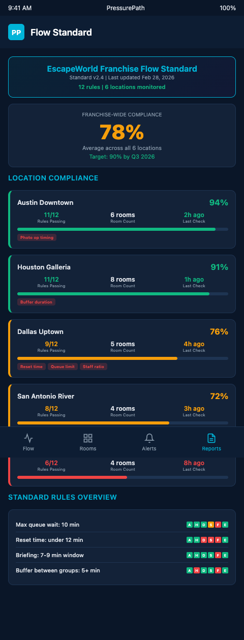 The franchise standard for flow shouldn't be a static document — it should be a simulation that each location can run against its own booking grid. Quality Control Checklist: Franchise Standards (Franchise Creator) reports franchises with robust quality control see 35% higher revenue than those without — but quality control in escape room operations means pacing quality, not just cleanliness or prop condition.