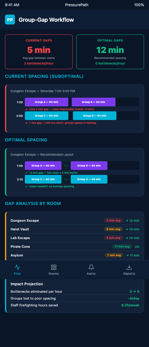 The group-gap workflow is ultimately a scheduling discipline: audit shared asset capacity, calculate minimum clear times, set start-time offsets by room type and group size, and review the resulting pressure map before each peak weekend. It takes 20 minutes to configure in PressurePath and prevents the 40-minute queue spirals that cost five-star reviews.