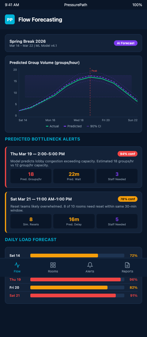 The pressurized-water model integrates the forecast as a pressure input. If the ML model predicts 20% above-average group arrival for Christmas weekend, PressurePath runs the simulation at that elevated pressure and shows you where the first junction fails — not in abstract terms, but at a specific timestamp: Room 4 exits at 2:12 PM while Rooms 6 and 8 are still running, the briefing room receives an unscheduled group at 2:15 PM, and reset station 2 is still working Room 4 when Room 6 finishes at 2:18 PM. The pipe network backs up at that junction.