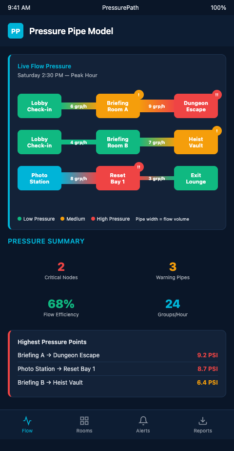 Multi-room franchise operators managing 8 or more parallel rooms are exactly who PressurePath was built for. If you want to model your actual booking grid as a pressure pipe network and see your Saturday collision map before it runs live, add your name to the waitlist — we're onboarding franchise operators in cohorts and will prioritize venues with 10+ rooms.