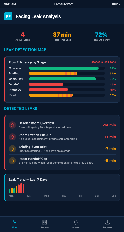 The pacing leak analysis maps every stage in your group journey against its variance profile and identifies which junctions amplify that variance into downstream cascading delays. Operators who submit three Saturdays of booking data with actual start times typically see a clear pattern: the same 2-3 rooms generate the majority of system-wide leak energy, and the same 1-2 shared assets absorb the compounding latency every week. Those patterns become the foundation for targeted schedule adjustments that prevent the leak from forming rather than absorbing it after it compounds.