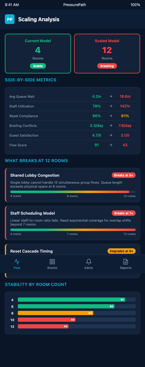 PressurePath surfaces these thresholds per location based on your actual booking data. You input your room mix, session lengths, and typical Saturday grid; the simulator shows you the exact room count where each failure mode first appears.