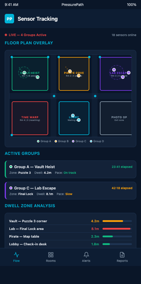 Sensor-driven group tracking eliminates that lag. When an entry door sensor registers a group entering the exit corridor, the system knows immediately — not when a GM notices and calls it in. That real-time signal feeds directly into the pacing model, which updates the pipe network's current state and projects the next 15 minutes of junction pressure.
