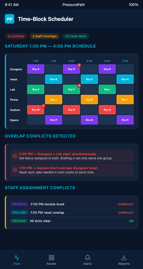 Franchise operators running 8 or more rooms who've built their booking cadence on universal intervals without a zone-level stagger analysis have almost certainly encoded briefing room collisions into their Saturday schedule. PressurePath can run a cadence audit against your existing booking grid and show you the specific interval adjustments that prevent those collisions — join the waitlist and specify your room count and current interval settings.