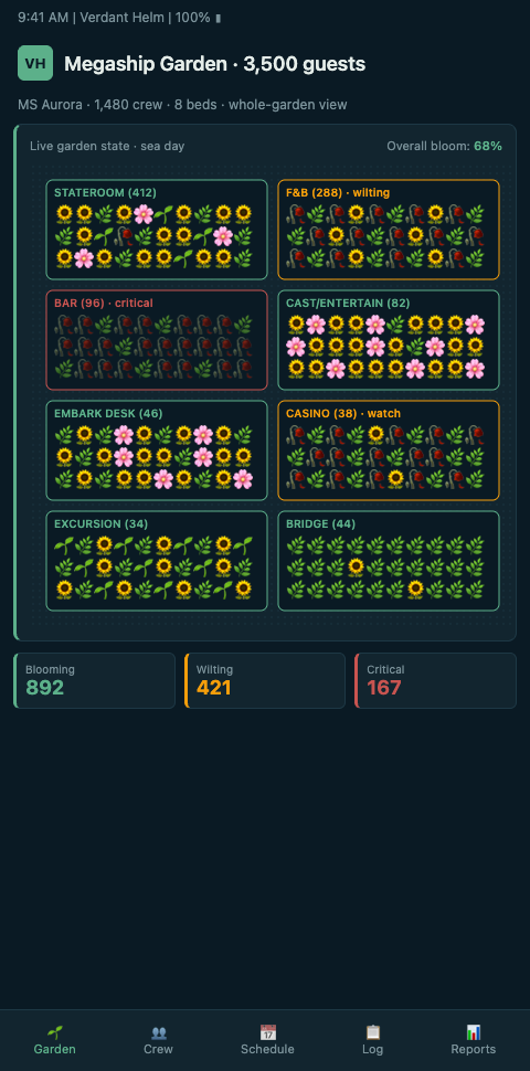 The botanical frame keeps the scale legible. Without it, a 19-venue dining operation reads as a spreadsheet. With it, the Italian specialty restaurant is a bed of perennials that bloom on a 7:00 and 9:00 two-seating cadence, drawing emotional labor from repeat guests and anniversary tables; the Lido buffet is an annual planting that must refresh every 90 minutes across breakfast, lunch, and dinner waves; the main dining room is a hedgerow that sets the voyage's NPS floor. Each bed has its own watering cycle, its own wilt signature, and its own prune-and-rotate rhythm. Verdant Helm's dashboard is a map of the garden with wilt overlaid in color — green bloom, yellow stress, red sink.