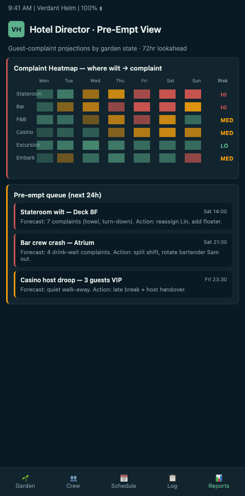 The Hotel Director role on a cruise ship owns hospitality, F&B, entertainment, and guest services. That span is what makes the garden view uniquely powerful in this seat — the HD sees beds that no other role sees from the same vantage. Verdant Helm's pre-complaint radar is built around that vantage.